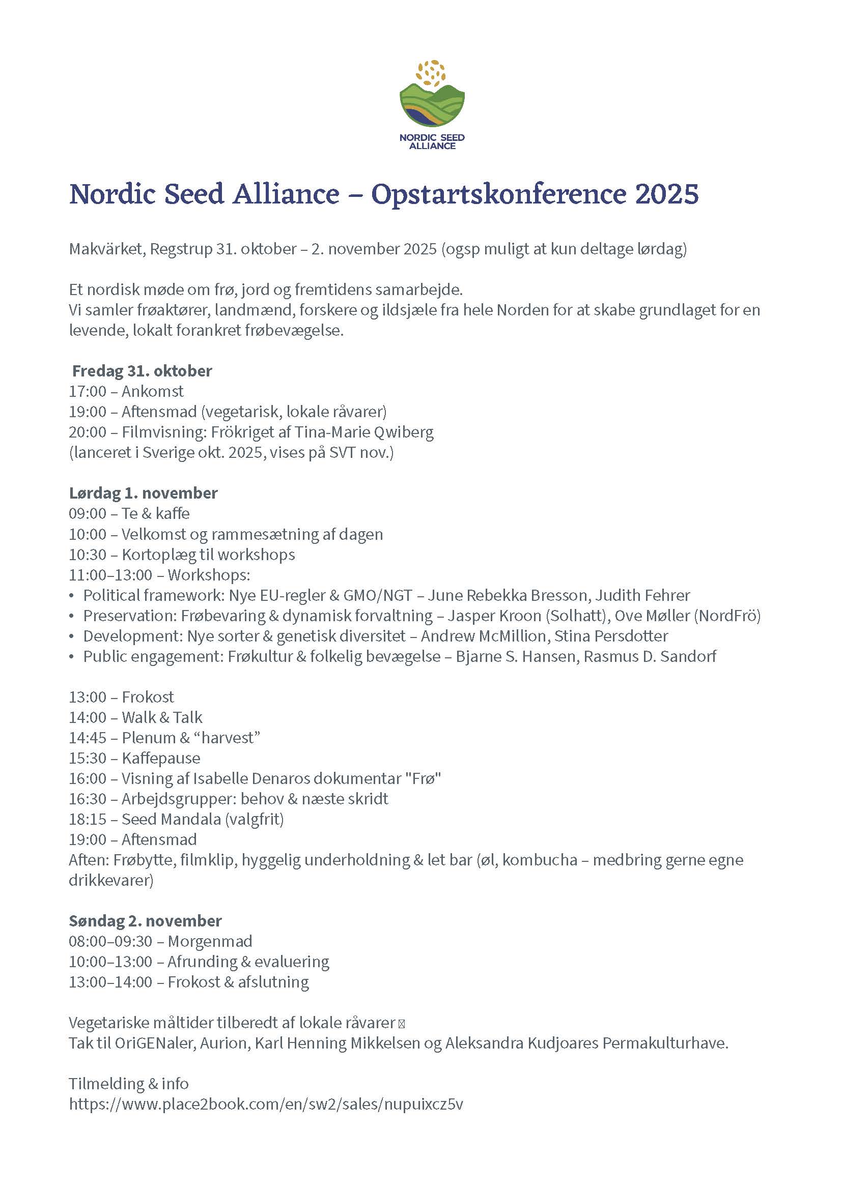 Til november mødes vi fysisk på Makvärket i Regstrup, Danmark til Nordic Seed Alliance’ første store konference. Her samler vi frøfolk, bønder, forskere, aktivister og haveentusiaster fra hele Norden for at fordybe os i frøets verden – fra politik og lovgivning til praktisk avl, bevaring og fællesskabsbaserede initiativer.